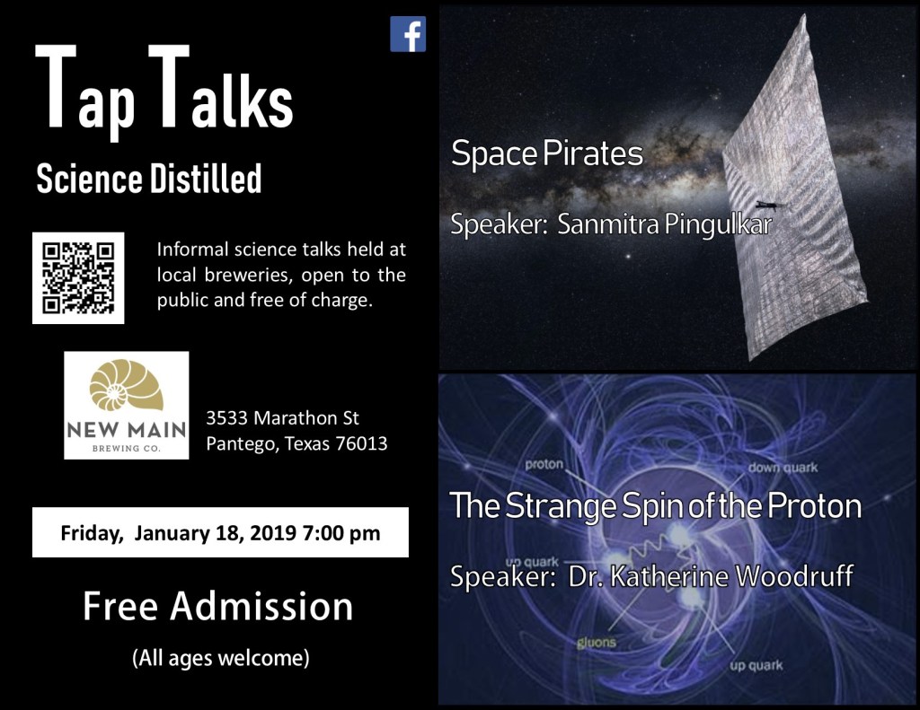 January’s Tap Talk (2019) Posted by dfwtaptalks on January 13, 2019October 4, 2019 January 18, 2019 How to become a Space PirateSpeaker: Sanmitra PingulkarThe Strange Spin of the ProtonSpeaker: Dr. Katherine Woodruff Share this: Click to share on X (Opens in new window) X Click to share on Facebook (Opens in new window) Facebook Like Loading... Related
